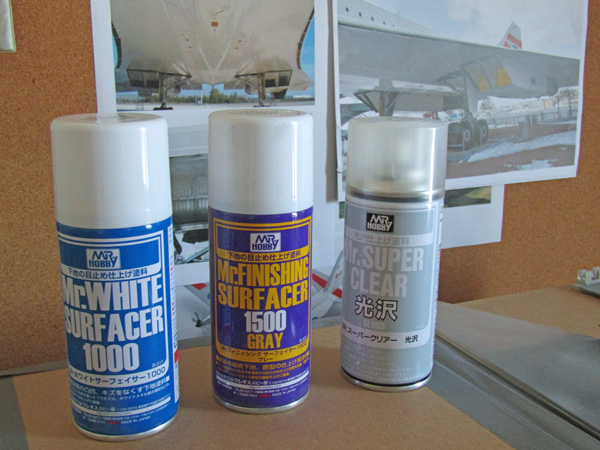 Mr Finishing Surfacer Gray 1500 from a rattle can, this has a great self-levelling characteristic.