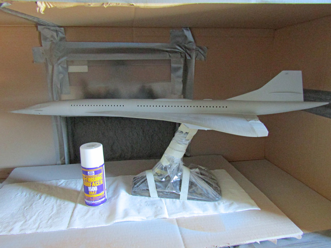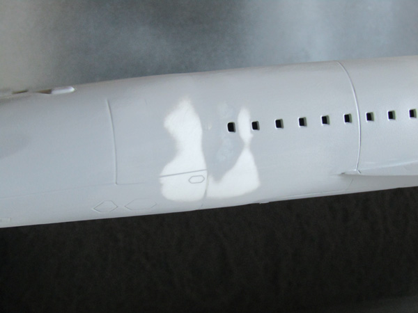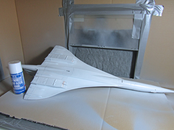 Some pre-shading of panel lines and recessed areas will help deepen the white tones before we overshoot with Mr Surfacer White 1000, again from a rattle can and it also has a self levelling characteristic that leaves a very nice surface for top coats.