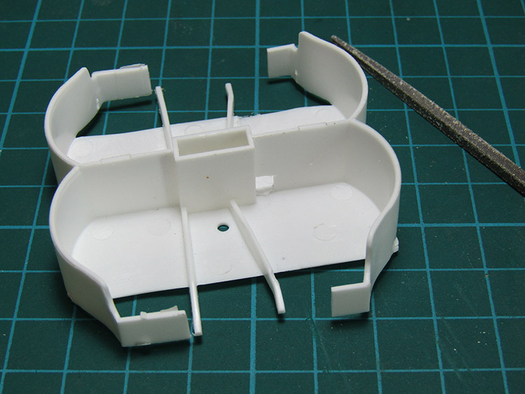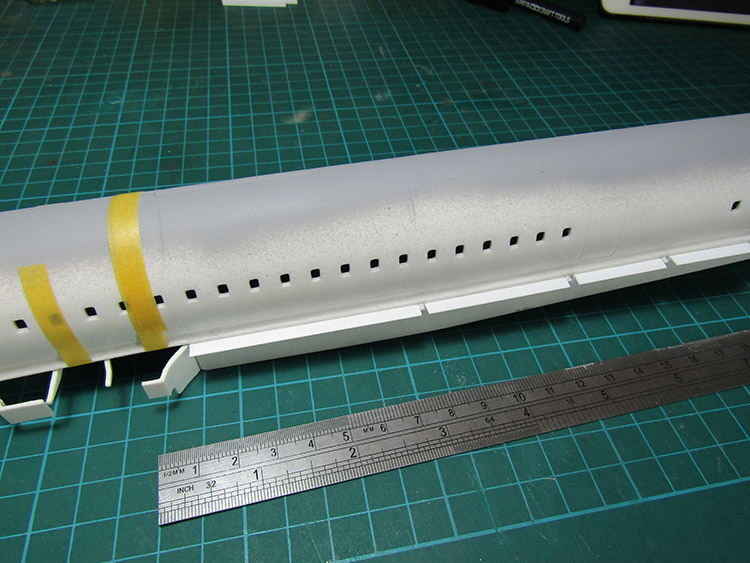 The wheel bay and mount is not yet glued in place but positioned with tape, as you will need to centralise it at a later stage.