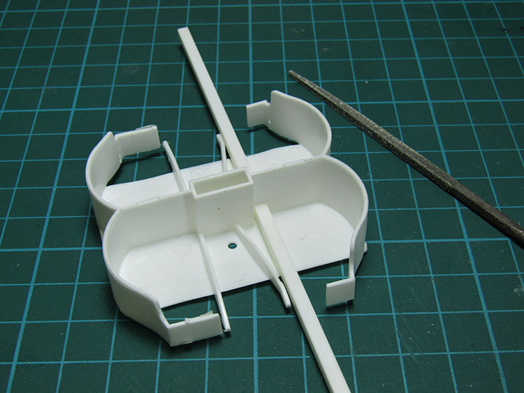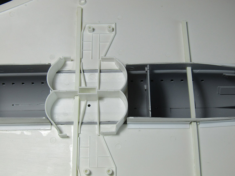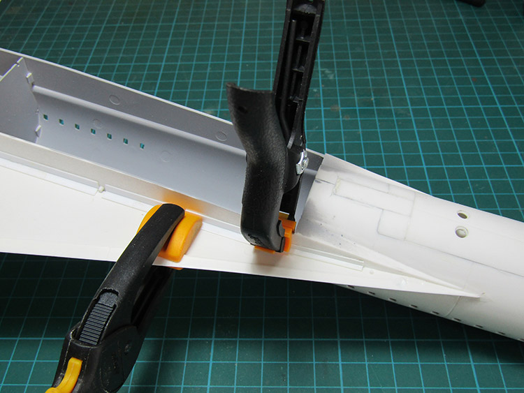 Using these tabs as a guide some L-shaped styrene is fitted in between each and creates a much larger glue surface for the wing upper surface as well as strengthening the join.
