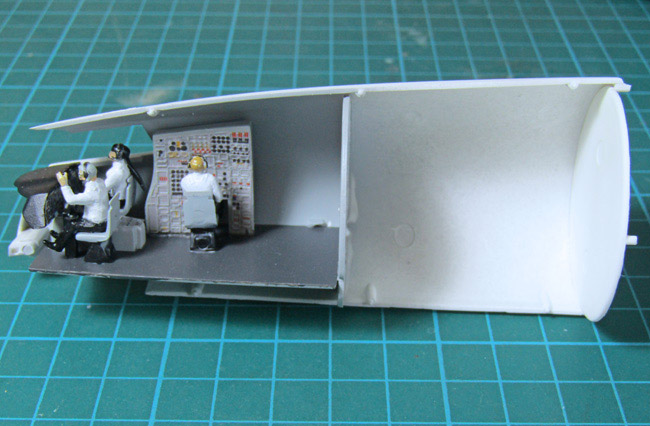 Interior of the cockpit can be painted in medium grey before fitting the simple and pretty inaccurate floor and instrument assembly. One point to note here, the engineer’s instrument panel will impinge over the starboard windows if left in its locating slot, however in any case you need to remove the floor locating tab and move the whole cockpit assembly back around 2mm, or the windscreen won’t fit, so problem with instrument panel gets solved anyway.