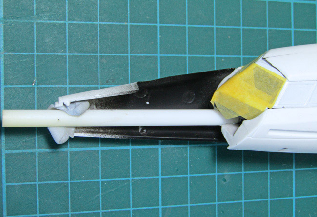 Centralised in place with Blu-Tac until the epoxy sets, ensures the nose alignment is straight. The rod is extended by 10mm to further strengthen the joint to the nose tip.