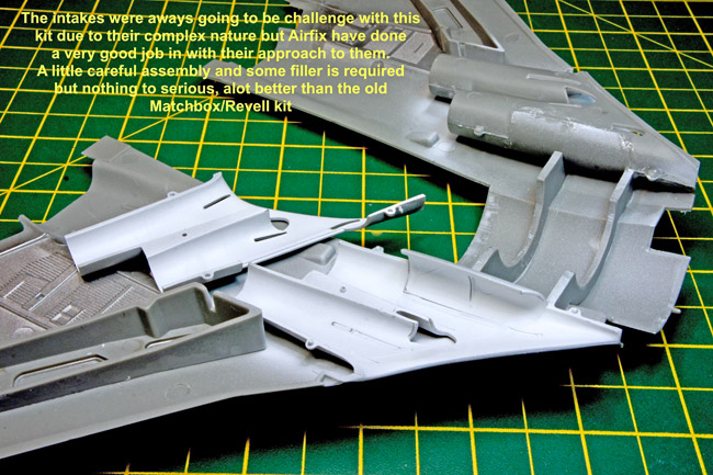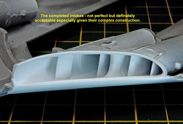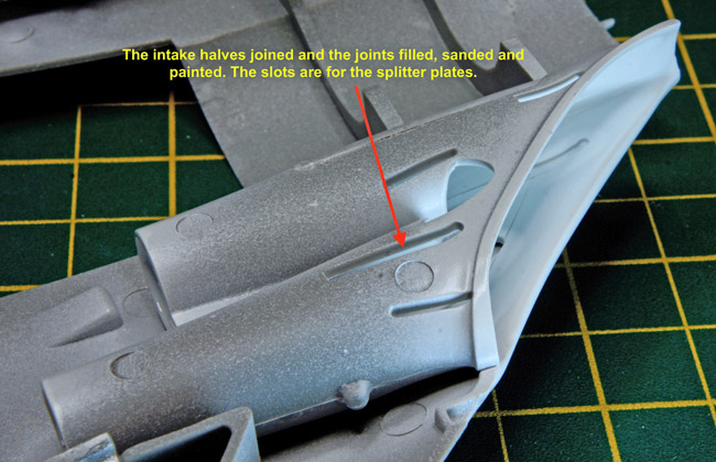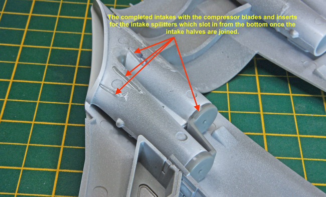 The splitter plates can then be slotted into the slots in the lower surfaces of the intakes and glued in position and its worth then giving everything a coat of white to blend everything in.