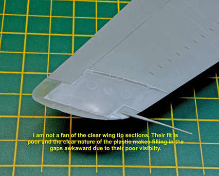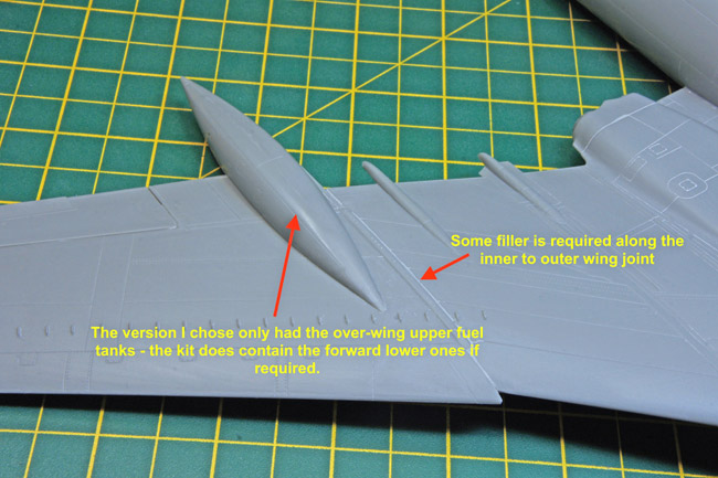 The rest of the wing can then be built up and attached to the fuselage. One thing I wasn’t keen on were the clear separate wing tips. Whilst I get the separate wing tips (the later tanker version had shorter wing tips) I really disliked the clear plastic just for the sake of the small wing tip navigation lights. The clear plastic makes it very difficult to see any gaps and steps in the joints and I also find it quite difficult to sand. Otherwise the wings build up reasonably hassle-free with just some filler being required here and there.