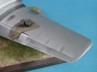 Of course, it would not be a real world model build without some last minute dramas. When gluing the canopy in place, I held it with some masking tape. When I gently removed the tape, the top of the “O” decal on the right side of the fuselage came away… A simple enough fix was to hand paint it black. Another problem that had occurred during the final days of construction was a crack in the top of the right wing. This crack, as you can see, extended almost the full length of the ammunition cover panel and was caused because of the very thin plastic there and my repeated handling. This problem required a different solution (see below).