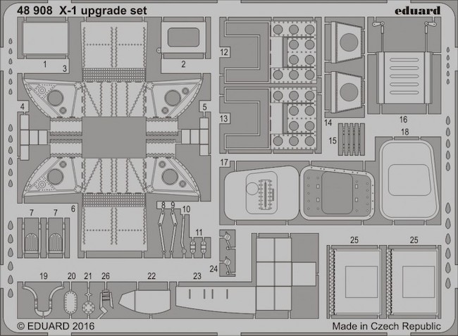 This version of the eduard kit has an additional PE fret with instrument panels, seat belts and an exhaust enhancement piece. Further it includes a set of resin wheels and the eduard Die Cut Canopy Mask set XF-061. However, I did obtain the Bell X-1 Upgrade set as well: