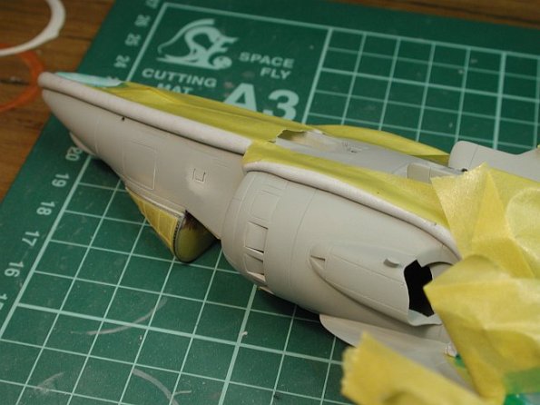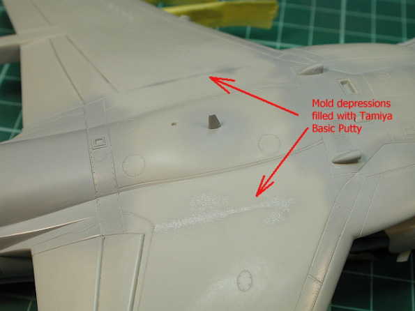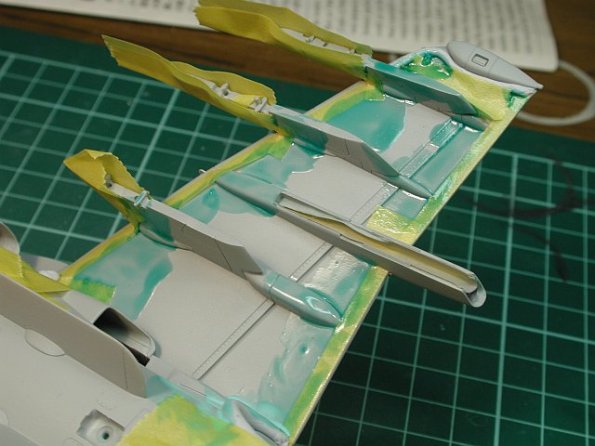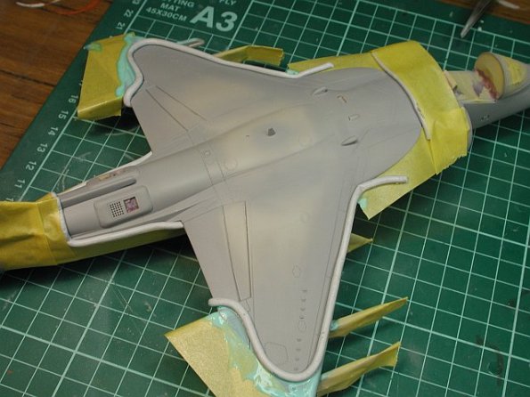 Once I had started masking I noticed a couple of nasty mould sink marks on the root of each wing. These where quickly filled with Tamiya filler and sanded smooth. This may only be on my Harrier kit, but it’s something worth looking out for.