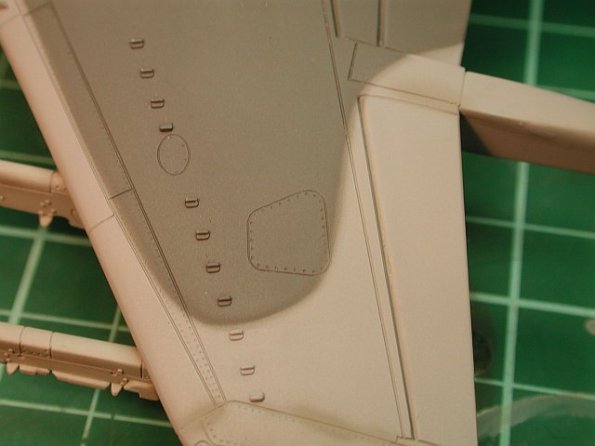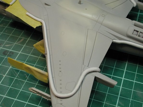 The USMC AV-8Bs carry a standard 3-tone colour scheme. I chose to a combination of TwoBobs and Hasegawa color recommendations. Bottom: FS36375 (Lt Ghost Gray – Hum 127), Side/Upper: FS36320 (Dk Ghost Gray – Hum 128), Upper: FS36118 (Gunship Gray – Hum 125). Here you see the bottom color has been applied and BluTac being used to provide a tight, yet feathered edge.