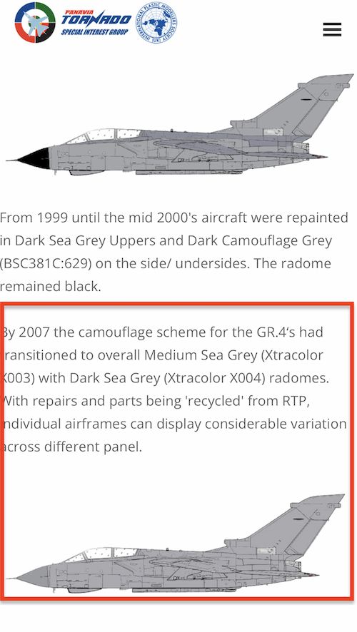 A little bit of research showed that the GR4 fleet changed its camouflage scheme over time from the green/grey of the 80’s and 90’s to a an all grey scheme in the late 90’s onwards (not forgetting the ‘Pink’ GW1 in 1991). Even this grey scheme changed from an initial two-tone grey camouflage with a black radome to an all Medium Sea Grey scheme with Dark Sea Grey radomes from 2007 onwards. The moral of this is check your references to see which scheme you need. As an addition you will see aircraft with a ‘patchwork’ of different colour panels as replacement panels were often sourced from aircraft with the previous grey scheme.