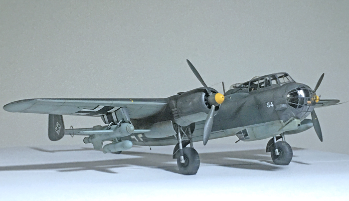 This is the Dornier Do 217 E-5 6N + NP, Werknummer 5554 (“54”), 6 Staffel II/KG 100, testing unit for the Henschel Hs 293 radio controlled glide bomb, southern France, September-October 1944. The kit is 1:72 Italeri, 2005 re-edition with extra parts of the venerable 1977 original tool. The Henschel bomb is the 1:72 Condor 1994 kit. I did my best effort to improve this kit by adding some aftermarket and some scratch building.