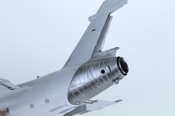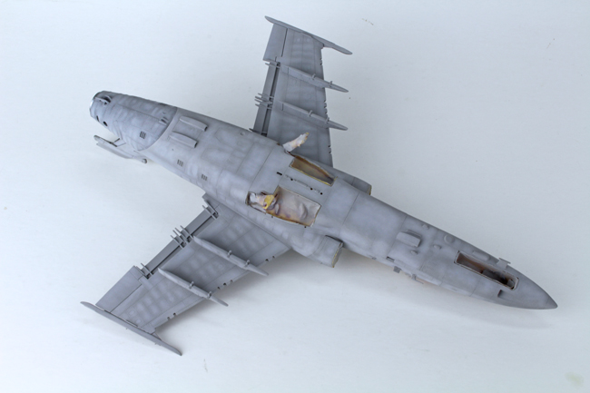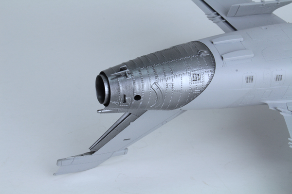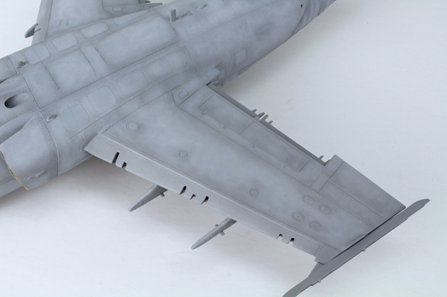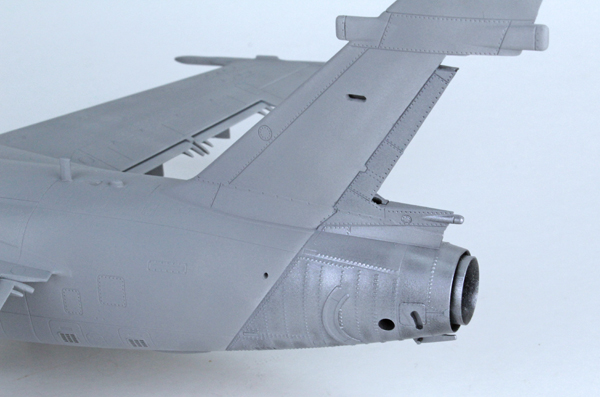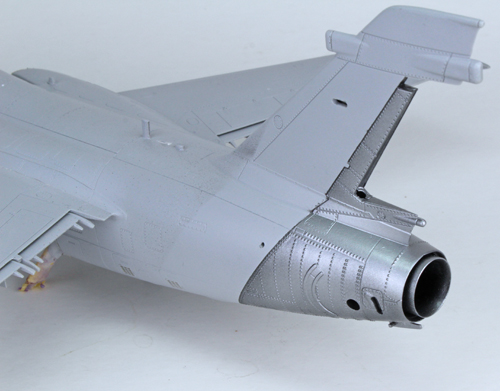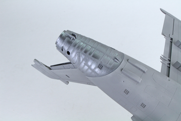Once this had dried, I used Alclad 2’s Aluminum to give a good metal base to work with. So it was time to start airbrushing the main airframe and Tamiya’s Sky grey XF-19 was used as the overall base colour. I avoided spraying a blanket coat of paint over the rear fuselage, but instead sprayed a light coat along the rivet lines. Once this had dried, an even mix of XF-19 and XF-2 (flat white) was used to create some highlights. This was sprayed in a random fashion within each panel creating a sort of mottled or marble look. Again this mix was used sparingly around the metal section of the fuselage.