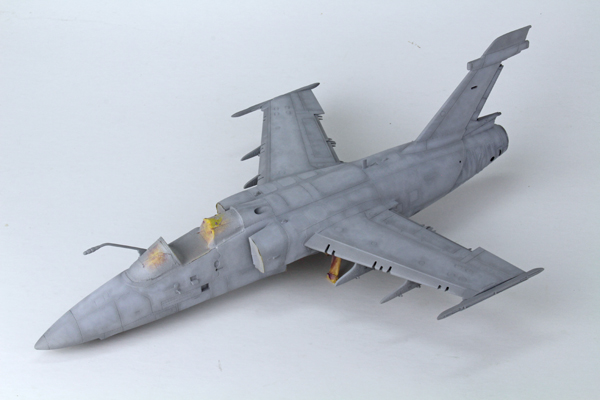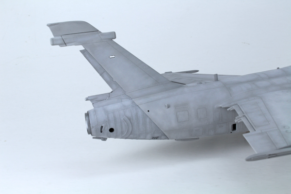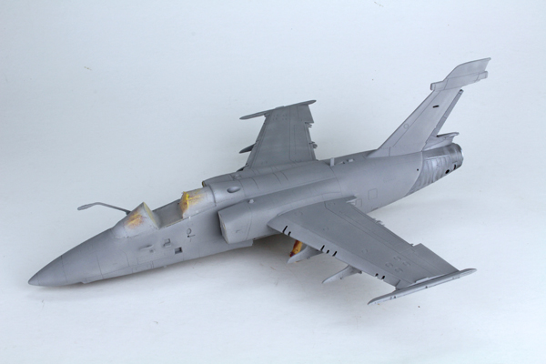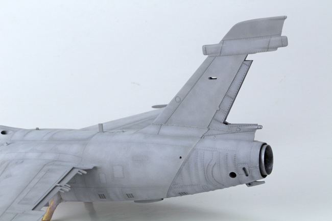 When looking at reference photographs of the AMX, I noticed that on a lot of examples there was a difference in the paint finish at the rear of the fuselage. Obviously caused by a different metal being used in the construction of the aircraft in this area, and the effects on that from the heat of the jet exhaust. The paint has thinned enough to reveal a hint of the metal underneath. This was something I wanted to try and capture on my model, so I began by masking off the rear section of the fuselage and airbrushed this with a light coat of Alclad 2 gloss black primer.