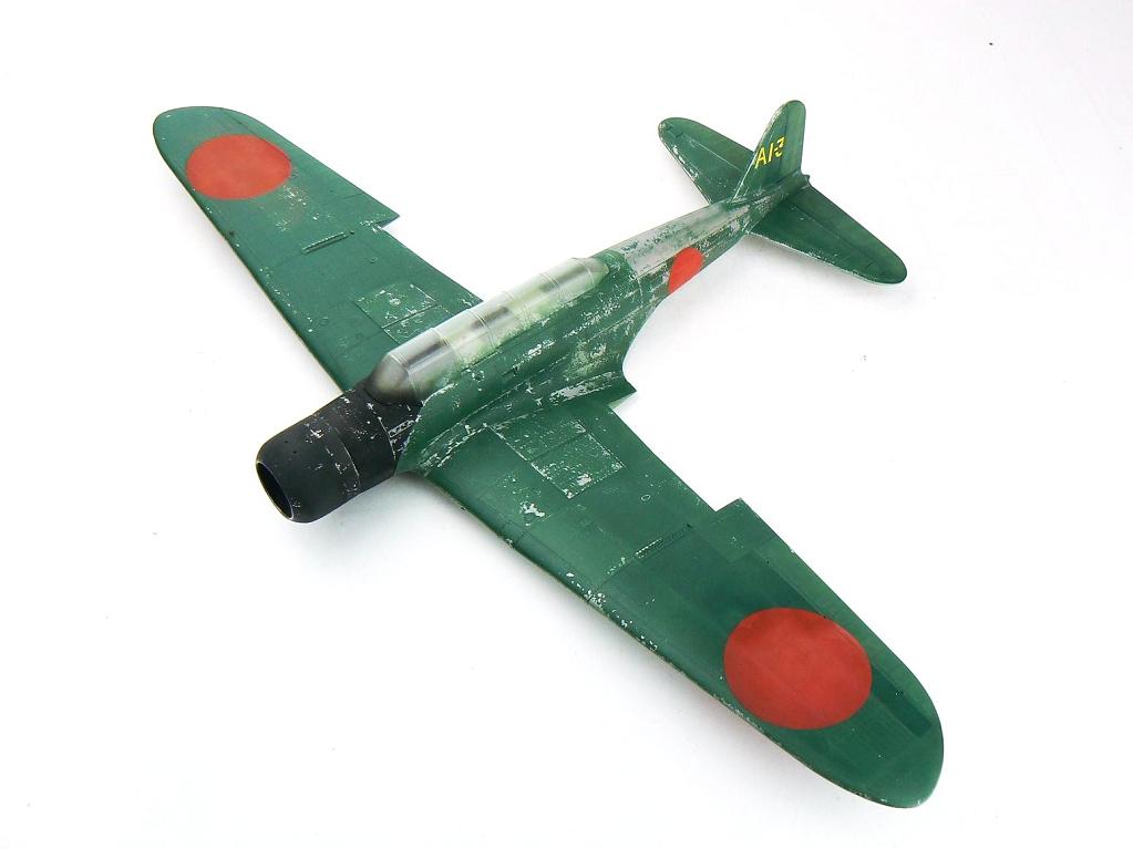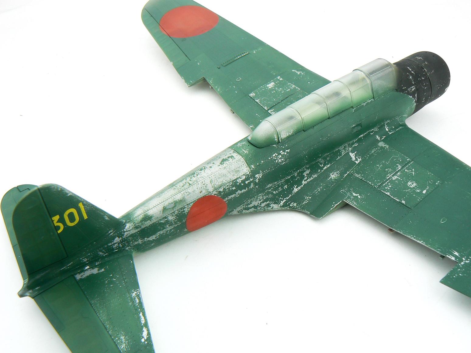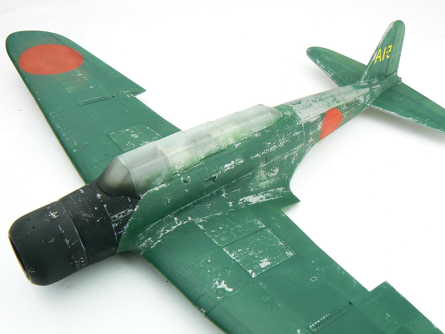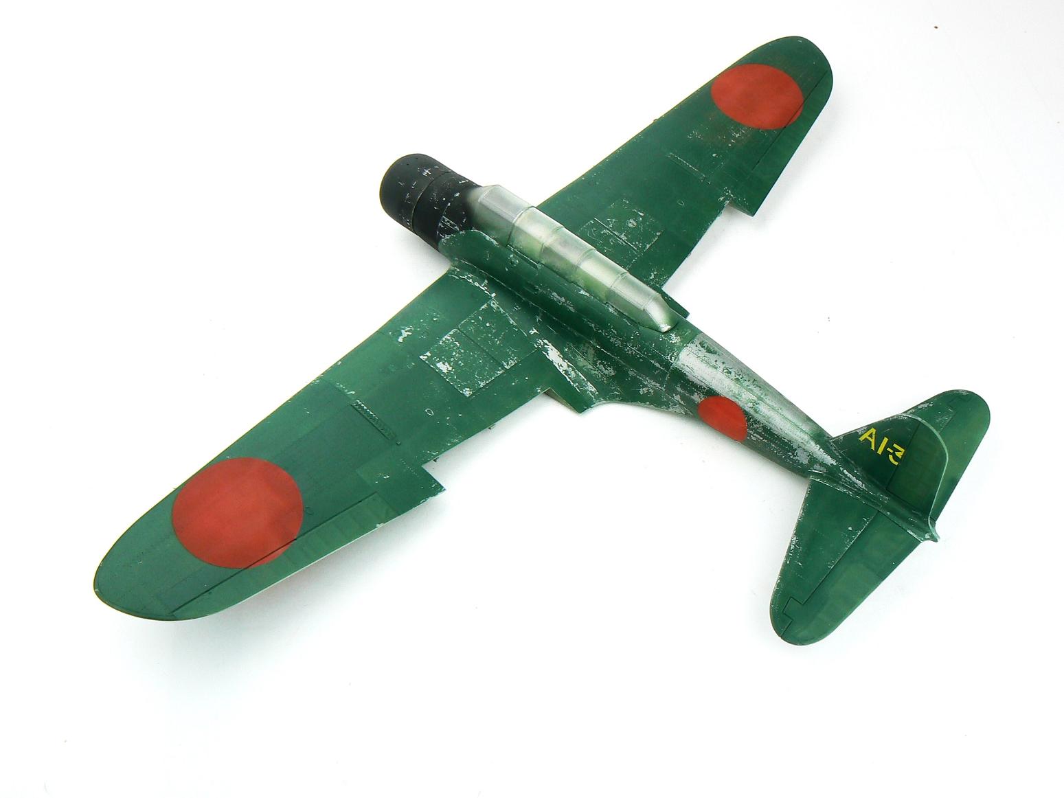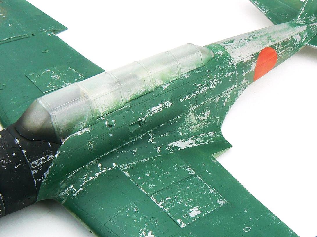 Now for the markings; I had bought the Montex set for this model however unfortunately the white surrounds for the Hinomarus were not for the aircraft in the set. I wasn’t worried though as this was not an actual aircraft (but no doubt some wag will state that it was impossible for an aircraft to have camouflaged undersides and plain red roundels though!). I advise you to remove some of the tack from the vinyl masks as they are very sticky and there is a risk that they may pull up the underlying paint, ask me how I know! You’ll also see from the photos that I have used kitchen foil to masks the big areas. This is great stuff as it conforms to the contours and holds itself in place (but I did back it up with masking tape I a few areas. And here is the finished paint scheme. Note the contrast between the heavy paint chipping of the camouflage and the relatively pristine markings, the paint used for these tended to be a bit more stable. Also, as I didn’t have the relevant tail codes I decided to use part of them and depict an aircraft with a replacement rudder.