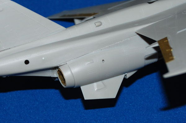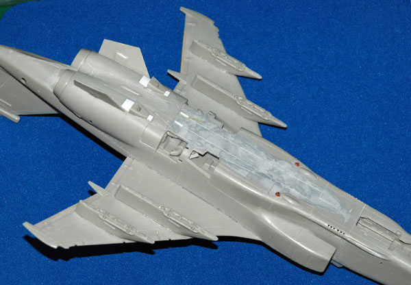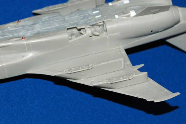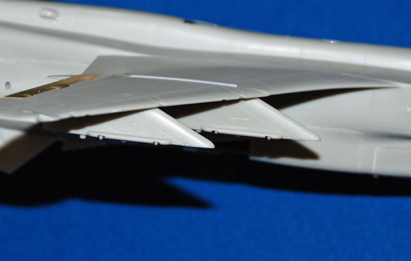 Looking on many pics of the real Jags the later aircraft like the GR3s have twin chaff-flare dispensers beneath the rear fuselage. The pics don’t really match up with the kit parts and I think what KH have tried to do is supply the parts as if the dispensers are fitted when loaded – that’s what it looks like but the rear box-like sections don’t always seem to be fitted (possibly only when ‘live’ and loaded?), leaving the rear of the fairing with a ‘stepped’ appearance. The book reference ‘Big Cat Diary’ mentioned at the head of this build has some good underside pics that clearly show how these ‘cut-away’ dispensers look.