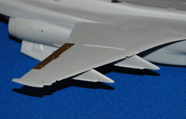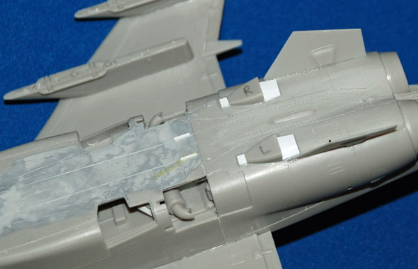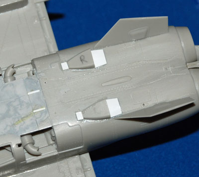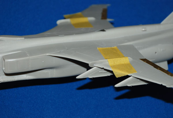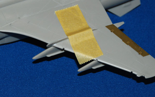 Remember the wing fences that we modified earlier from the over-wing pylons? These are now attached with liquid poly and just to ensure that they don’t lift and stay aligned I secured them with Tamiya tape while the glue dries.