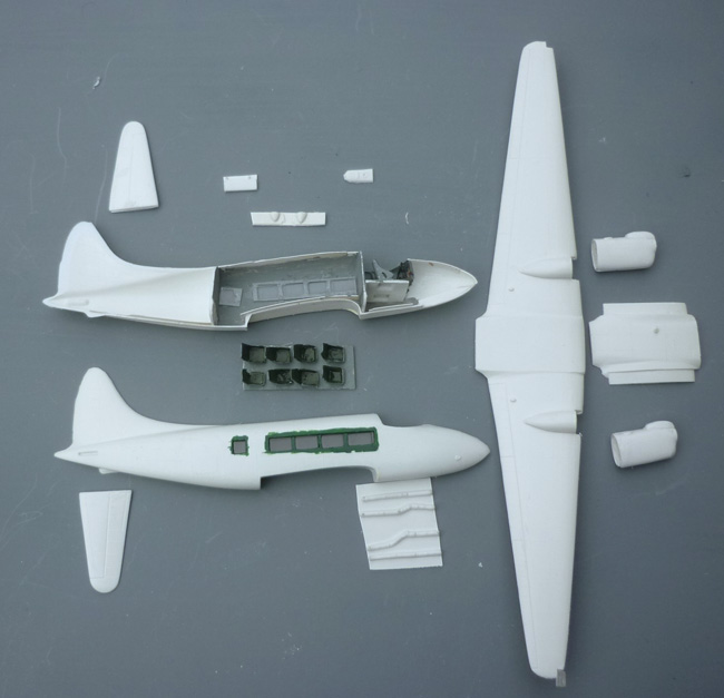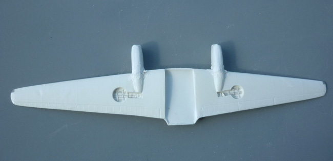 I chose the right style of engines for the Sea Devon as the kit has alternative parts for the earlier Devon. I packed the engines with filler on the assumption that even with the nose packed full, it could still be a tail-sitter. My approach is one of better safe than sitter. The engines were then attached to the wings and filler used to smooth over the join.