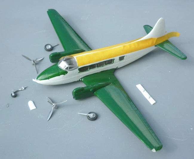 The metal parts had to be cleaned up using files and sandpaper. The props and spinners were painted in a bright chrome paint.
