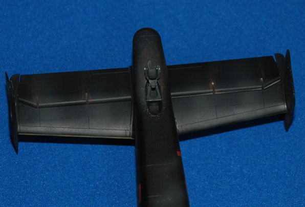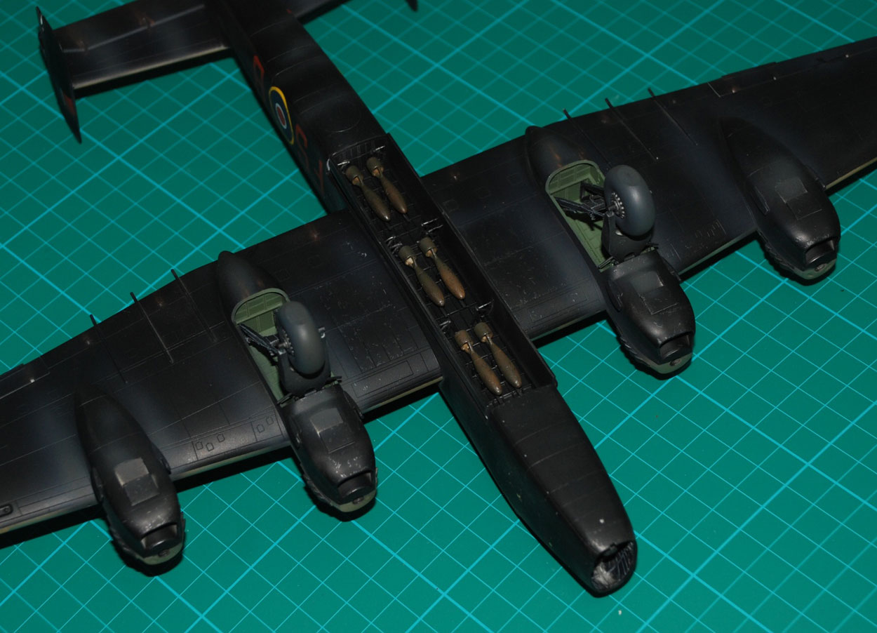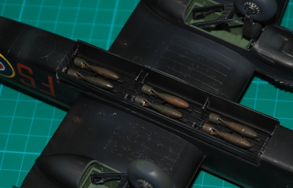 Exhaust staining was sprayed with well-thinned grey – a darker tone first, then a lighter shade for the inner area. Some of this is run out across the underside of the real tailplanes and above to further suggest a bit of a workhorse in Theatre. You can also see the bombs are installed in this set of images, along with the main undercarriage units.
