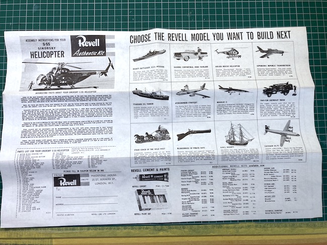 With the recent re-issue of the Airfix 1:72 Whirlwind HAS-22 under their Vintage Classics branding providing an itch to scratch so to speak, it was a case of what’s out there in 1:48 (my preferred scale). Basically it boils down to various boxings of the old Revell Sikorsky S-55, if you can find one. Well as luck would have it I placed the wining bid on an early boxing in a Veteranus auction on Facebook.