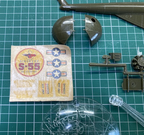 The transparencies are quite thick, and after years jiggling around against the other parts were not what could be called clear! The decals had also suffered over time, they were for a US S-55 Chickasaw with only the basics covered, and they looked way past their best.