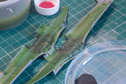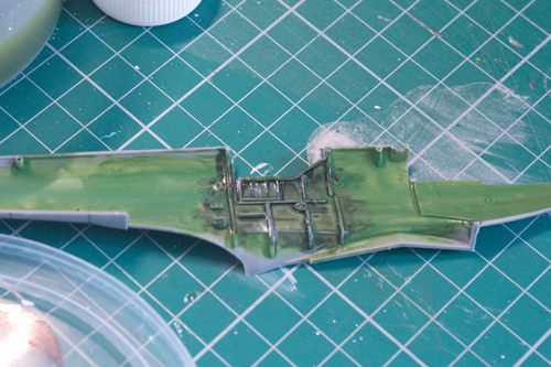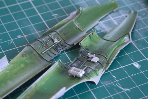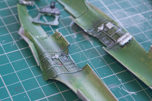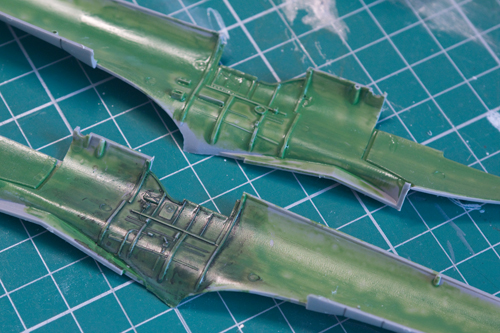 The first thing I do is I take flat brush (size 6) and spread a nice thin layer (diluted with tap water) of green paint on the panel. I don’t put on any additional coats. This is because the paint is so thin that when it dries, it leaves patches where the paint hasn’t spread evenly. This is a fair representation of the paint degradation inside the cockpit. When the paint has dried (after 15-20 minutes, presumably), I use black fountain pen ink as an alternative to panel line accentuating fluid. The ink is watery as it is, but it may still leave a fairly opaque layer of black on the panel. It is a good idea to dilute it still. This is a matter of estimation depending on what ink you have, so you should try your measurements. I find that it is much quicker to cover the entire panel with a large flat brush than it is to paint along the individual panel lines. When the ink dries, the original colour of the panel will have become darker as seen in the picture.