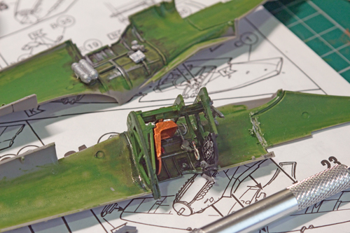 When the engine is done, it is a good idea to mount it to the inside of the fuselage to see if it fits and if all the parts are in their respective holes. I don’t glue it in just yet, because we still have some work to do on the fuselage.