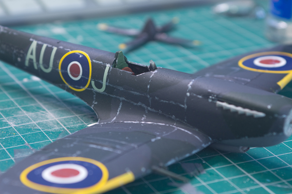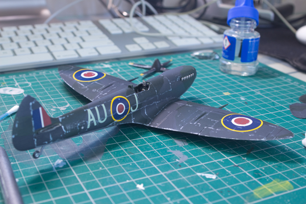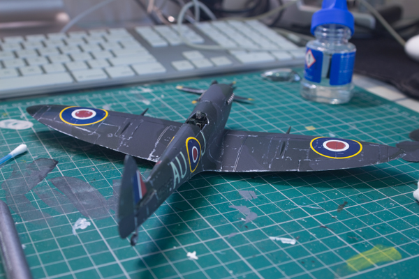 After wrapping up the painting, I start applying the decals. To me, decal softener is an indispensable tool. It makes the decals adhere to the body of the aircraft, so the decals end up sinking into the panel lines. If you don’t have access to decal softener, you can use plain old white vinegar instead. Although, undiluted vinegar is far too strong, so a ratio of 1 part vinegar to 7 parts water is adequate. Don’t take my word for it as the ratio may vary with the sort of vinegar you decide to use. With all the decals applied, we can start weathering the aircraft.