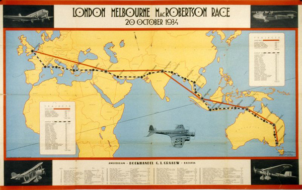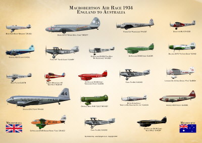 The MacRobertson Trophy Air Race (also known as the London to Melbourne Air Race) took place October, 1934 as part of the Melbourne Centenary celebrations. The idea of the race was devised by the Lord Mayor of Melbourne, and a prize fund of $75,000 (Australia used £ at that time) was put up by Sir Macpherson Robertson, a wealthy Australian confectionery manufacturer, on the conditions that the race be named after his MacRobertson confectionery company, and that it be organised to be as safe as possible.