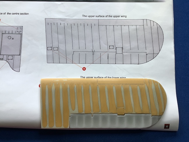 …which when applied and primed looked good enough to my eyes. On the centre section I also sanded off the rather heavy framing for the fuel tank and replaced it again with vinyl. This detail shot gives a good idea of the top wings: