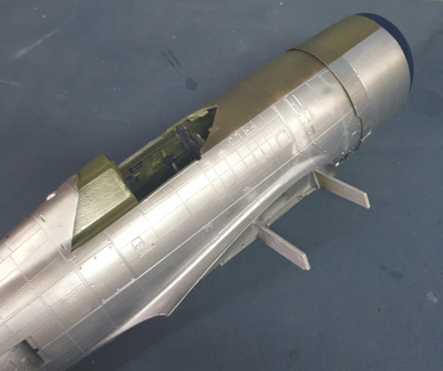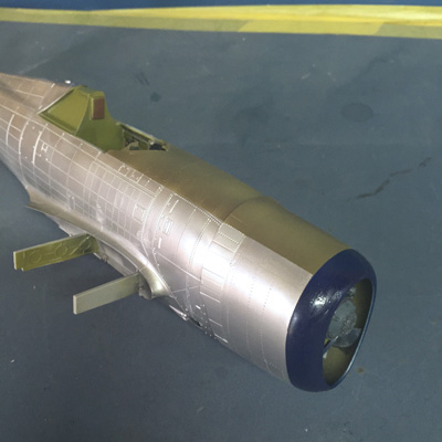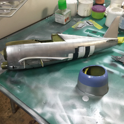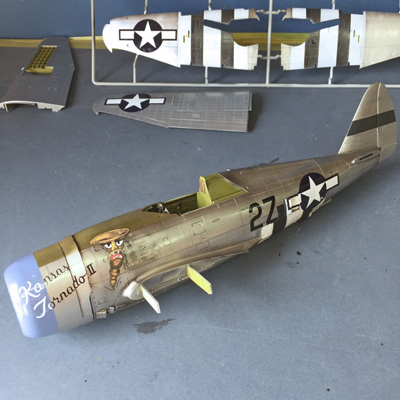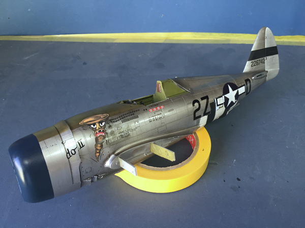 Before applying the decals, it was time for some masking of the black stripe on the fin, painted with Tamiya NATO Black) the Faded Olive Drab anti-glare panel, invasion stripes and of course the blue cowling ring. I had seen this ring painted a medium blue on a 1:72 build in a paper magazine. The builder is someone I admire and went for it with a similar Tamiya Blue. It came out great and I loved the colour and ploughed on to the decal phase thinking nothing more. The Barracuda decals went on beautifully and lay down smoothly without any trace of carrier film.