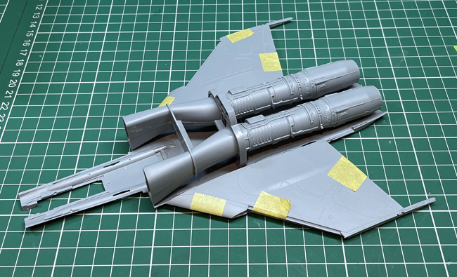 The lower wing section with the engines attaches to the separate upper wing sections and taped that up to dry. Again, flawless – no filler at all for the main wing join and you definitely feel progress is rapid :)