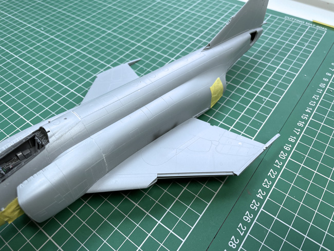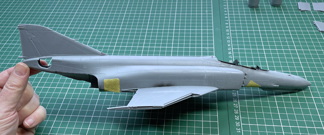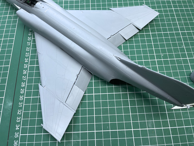 Decide how you want to position the flaps and leading edge slats (retracted or blown), use the appropriate parts, assemble and very soon you have a very nice shape forming – the unmistakeable lines of the F-4E Kai. I added the nose cone at this stage too, along with a little plasticine and metal weights to make sure there’s no chance of the model tail-sitting. The nice gun fairing is also added now.