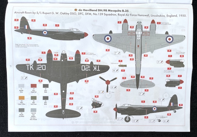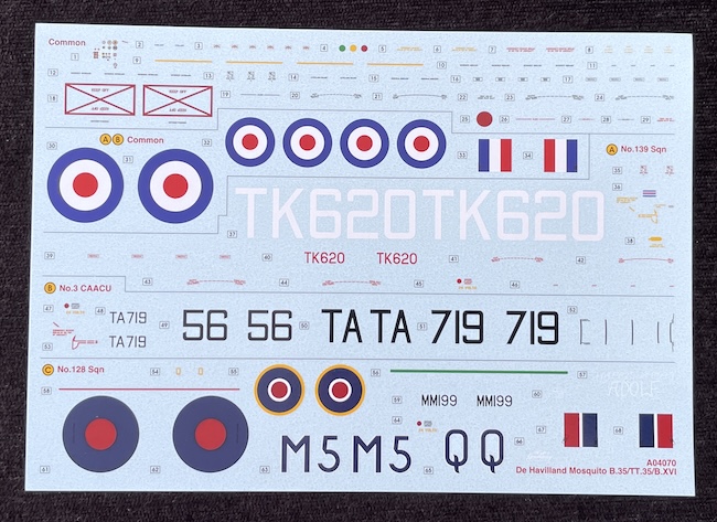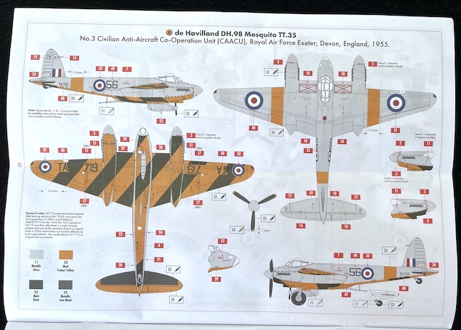 - Marking options for 3 distinctive new schemes which tell the story of the Mosquito’s changing roles in late World War 2 and into the post-war era- including the colourful TT.35 target towing variant “TA719” which survived into preservation.