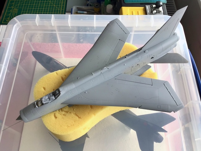 With these internal items fixed in position the main airframe construction could proceed with good pace. After the obligatory remedial work on seams and reinstating lost recessed detail due to the preparatory work the model received a first-stage priming coat of Mr.Surfacer 1200 Grey Acrylic/Lacquer applied straight from the rattle can.