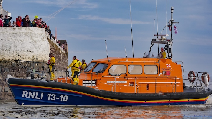 (Photo: Shannon Class 13-10, RNLB Ian Grant Smith viewed from its port side entering Arbroath Harbour. Courtesy: Anthony Leigh, Aurora Media Group International LTD)
