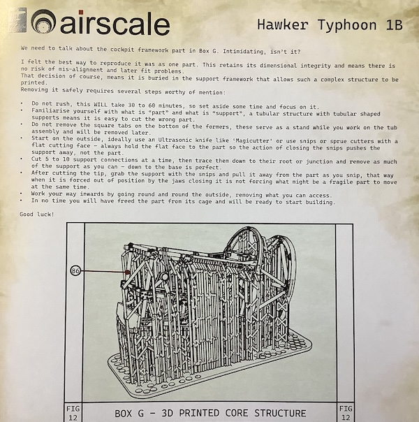 It’s a refreshing change to have some instructions which are written rather than often vague ambiguous drawings only. Peter offers sound words of advice about starting the kit with the cockpit which is Box G. The main structure of the cockpit framework is printed in one piece but it is “buried deep in a support framework”. Each support to be removed must be done carefully to ensure that they are indeed supports and not part of the cockpit; side cutters and ideally an ultrasonic knife are the best tools for this operation.