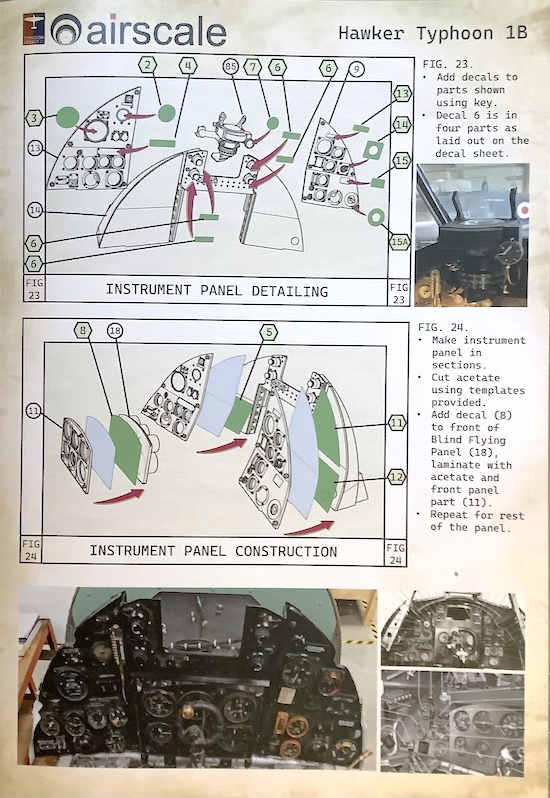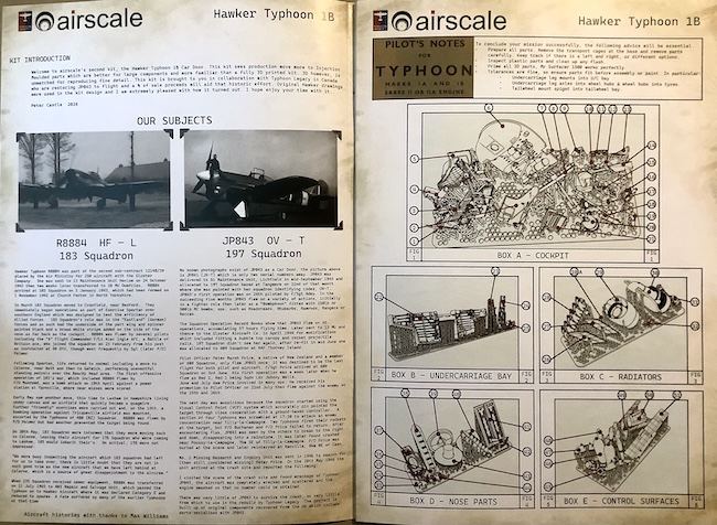 ….and commences with an introduction (written by yours truly) about the two Typhoons which can be built from the kit, namely R8884 of 183 Squadron and JP843 of 197 Squadron. The differences in fit and equipment are highlighted throughout the concisely written instructions.