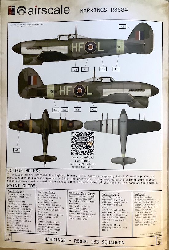 Comprehensive colour profiles (drawn by Darren Prior) and guides are shown for the two Typhoons, plus clear drawings showing the positions of stencils and colour guides. On each colour profile is a QR code which when scanned takes you to a website where downloadable marking masks are available.
