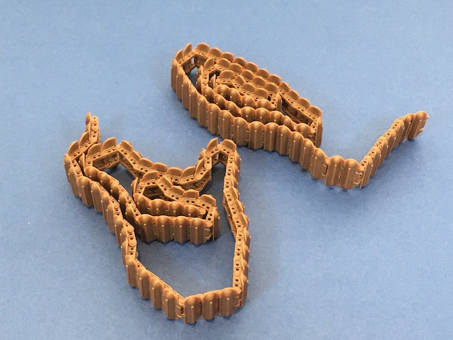 The single link tracks are very easy to assemble. A little clean-up of each link was required, but less than would have been required had they come attached to sprues. The joints between the tracks are not very strong and so I glued them permanently to the model before it was painted. Any inaccessible areas were airbrushed in black before the tracks were added.