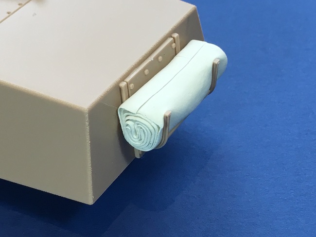 Many of the photos of the ARL 44 that I have seen show a tarpaulin carried on a rack on the back of the turret. I made one of these from Milliput rolled into a thin sheet between two pieces of baking paper with liberal amounts of talcum powder used to stop everything sticking to everything else. The Milliput sheet was left for about an hour so that it had just begun to harden before it was cut into a rectangle and gently rolled up and pushed into place. Leaving the Milliput to harden slightly avoided the problem of getting fingerprints in it when I rolled it up, also thwarting any future police investigations into my activities.