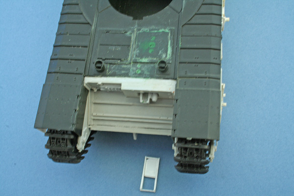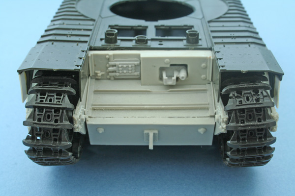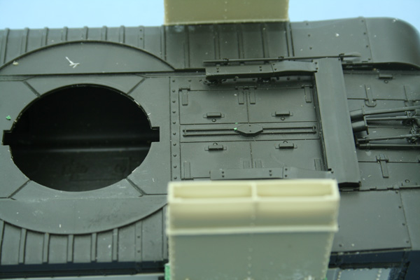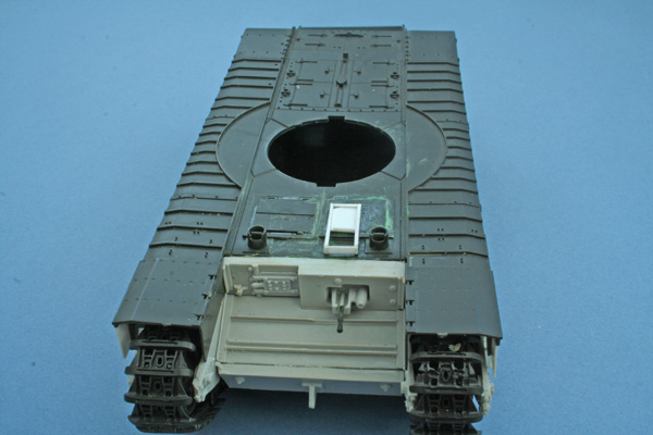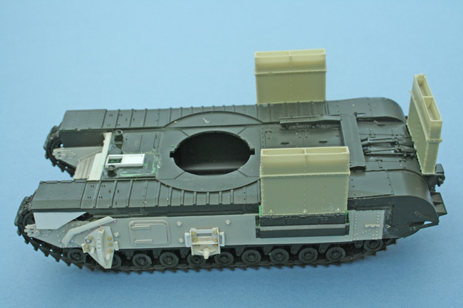 The middle periscope was removed and the driver’s hatch put in place. The tank was armed with a Spigot mortar firing a demolition charge which was loaded from inside the tank via a sliding hatch replacing the hatch for the hull gunner. The kit hatch was reversed to fill the gap and the new hatch glued into place.