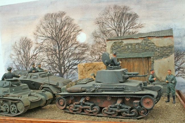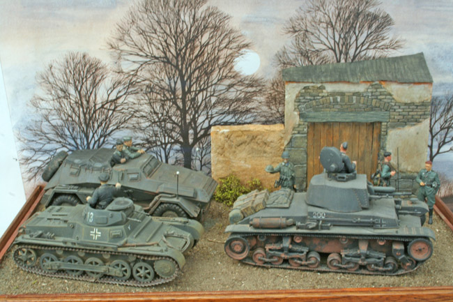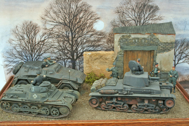 Despite being outnumbered by the Allied forces, Germany was able to overcome the combined armies of the Low Countries and France through the tactics of Blitzkrieg. A key feature of the tactic was the lightning deep penetration strikes cutting supply lines and disrupting troop movements. The following diorama was constructed to represent part of an armoured column that led the attack.