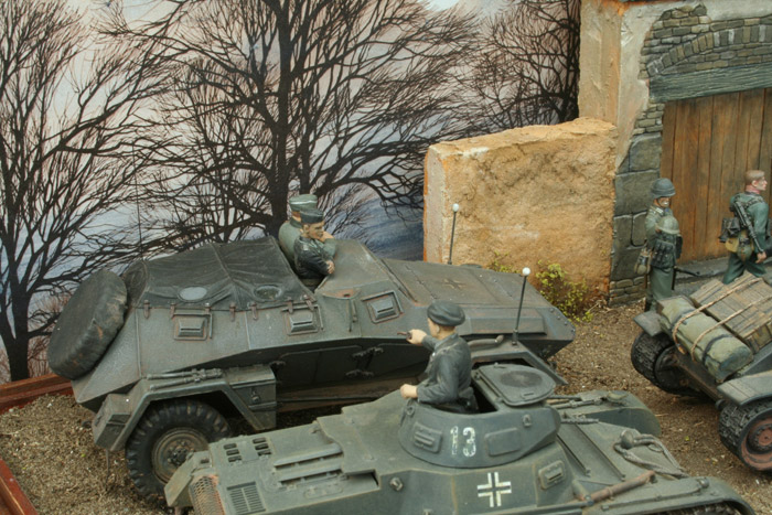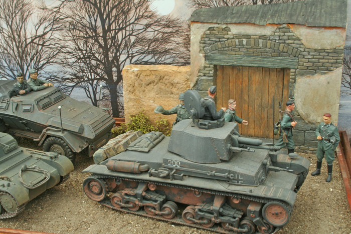 The vehicles used in the diorama included Sovereign 2000 SdKfz 247 command car used by senior artillery officers, the diminutive Italeri SdKfz Panzer 1 and a Czech Panzer 35t from CMK.