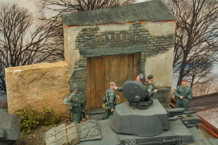 The roof of the building was deformed to give the typical well-worn/battered appearance that corrugated iron panels take on. Although only four infantry figures were used, they were considered sufficient to give the impression of a column supporting the armour.
