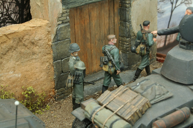 Figures came from a variety of sources including Dragon, Verlinden and Andrea being a mixture of 1:32nd and large 1:35th scale. The positioning of the figures within the diorama was made to infer a relaxed confidence amongst the advancing soldiers.