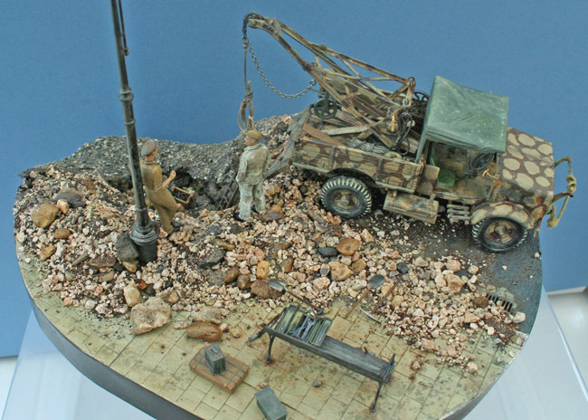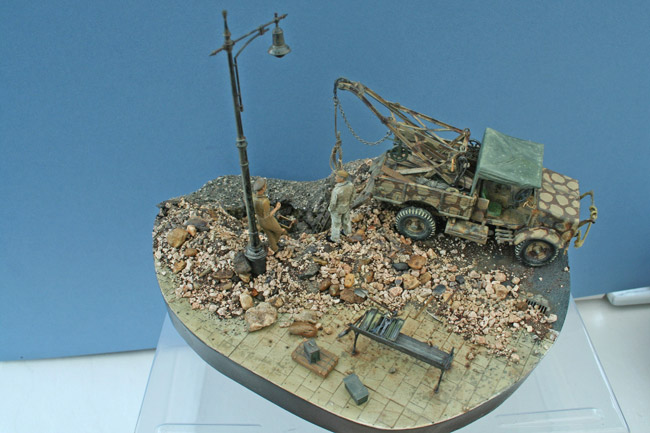 Given the weight of the truck, this meant the base had to be counterbalanced to avoid it tipping. To achieve this, the crater was cast in plaster and concrete then inserted into the base and its edges blended in to the whole.