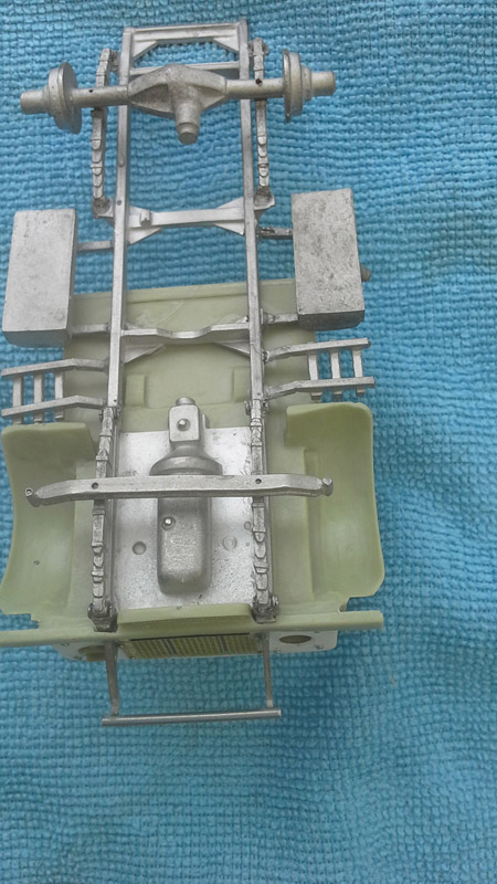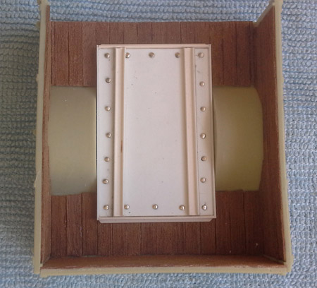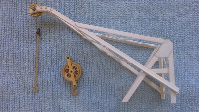 The crane was constructed using the photograph as a guide using pulleys from a model ship. A baseplate was fitted to the truck body to secure the crane to.