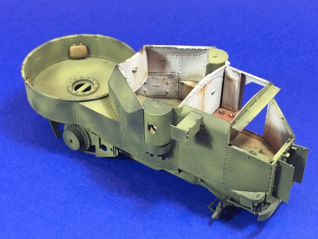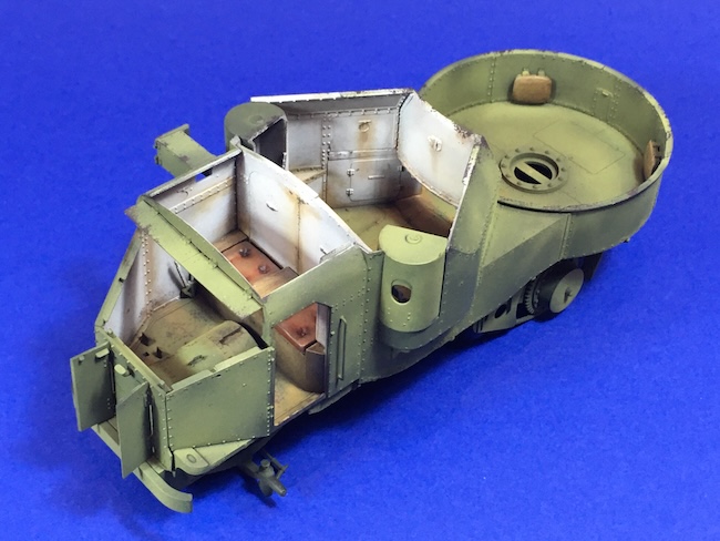 With the masking removed, chipping was applied to the interior of the model using Vallejo German Camouflage Black – Brown. General dirt, staining and dust were added using pastel chalks. According to the Copper State instructions, the driver’s seat appears to have been made of wood which was replicated by painting the part in white and then scrubbing raw umber oil paint over it. Most of the oil paint was then removed with an old stiff oil painting brush to represent the wood grain. I’m not actually convinced that wood grain would be visible in this scale, but replicating it seems to be ‘the thing to do’ these days and so there it is! The leather cushions were painted in a similar way, but using burnt sienna oil paint to replicate worn leather. This time the oil paint was removed using a piece of sponge.