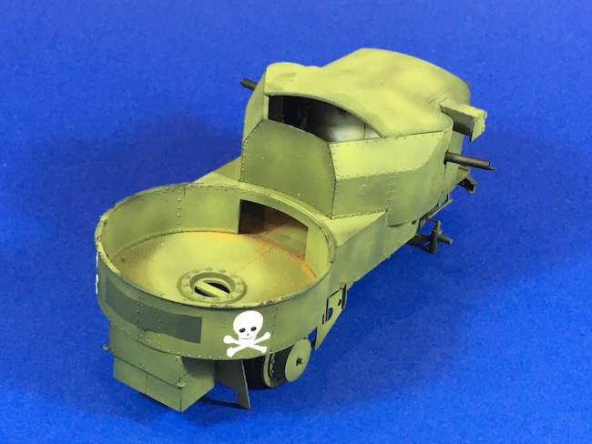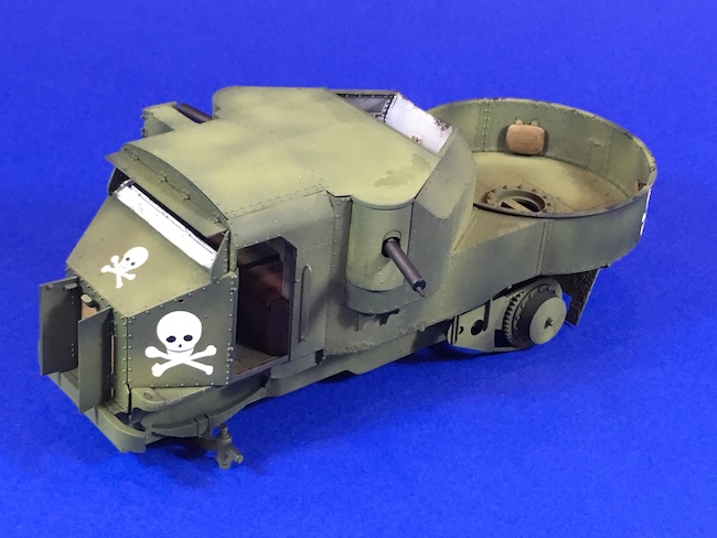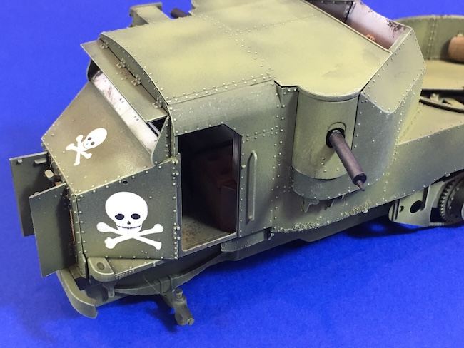 Note that there is a dark green patch on the rear of the vehicle. This is supposed to be there. I believe that this was where the previous vehicle name / slogan was roughly painted out before the skull and crossbones insignia were applied.