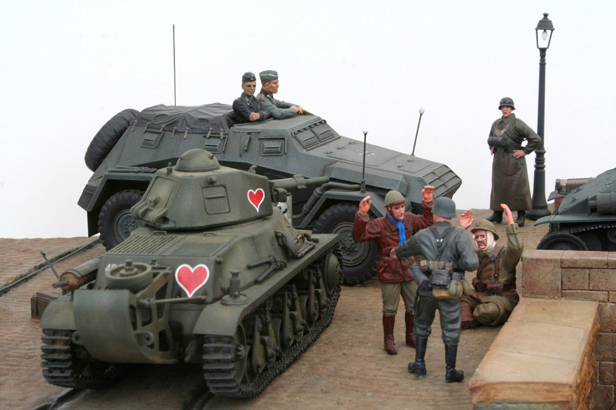 To represent the coordinated command structure and concentration of armour used by the Germans along with the French practice of dispersing its armour in support of infantry, I used a PzKpfw 35(t) in conjunction with a PzKpfw 247 command car passing an abandoned Hotchkiss 49 light tank. The German success was dependent on mobility with river and canal crossings being key objectives therefore the diorama was built around the capture of a bridge. The bridge is a Royal Models accessory, kit 347.